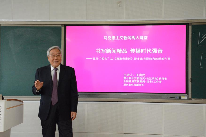主办的马克思主义新闻观大讲堂第10讲在第三教学楼A503教室举行。原河北人民广播电台副台长王喜民应邀作题为“书写新闻精品 传播时代强音”的学术讲座,相关专业教师和学生共100余人参加。